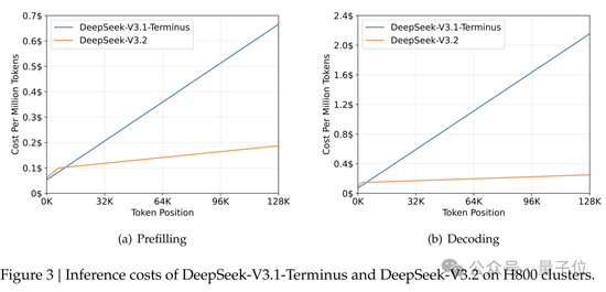 在128k长度的序列上,DeepSeek-V3.2的推理成本比V3.1-Terminus降低了好几倍。