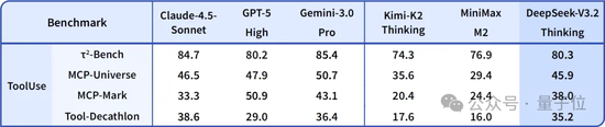 在MCP-Universe和Tool-Decathlon等工具使用基准测试上,DeepSeek-V3.2也展现出了接近闭源模型的性能。
