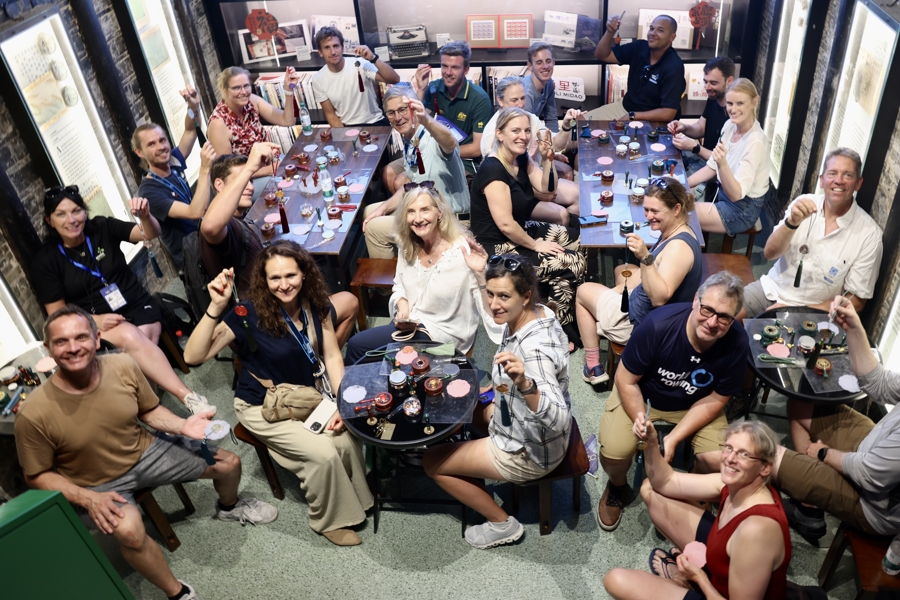 即便见惯了赛艇航道上的碧波翻涌,在朱家角的水上体验环节中,大家依旧难掩兴奋。橹声欸乃,水波荡漾,手中的相机和手机,不断记录着两岸白墙黛瓦的民居、蜿蜒的水巷与形态各异的石桥,眼前的景致宛如一幅流动的水墨画卷。来到始建于1903年的大清邮局,传统火漆封蜡制作中国结挂坠的活动更是让众人跃跃欲试。