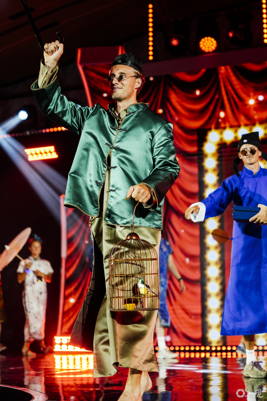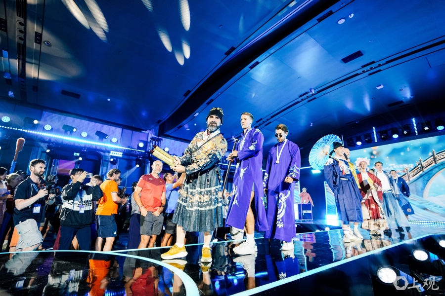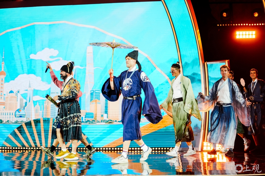 闭幕式上的T台走秀,一群外国选手展示东方美学:穿唐装的、披汉服的,有人手持折扇摆pose,有人提着鸟笼学步态,还有人拿起竹笛、琵琶试着拨弄两下,中国传统服饰与赛艇运动服相映成趣。