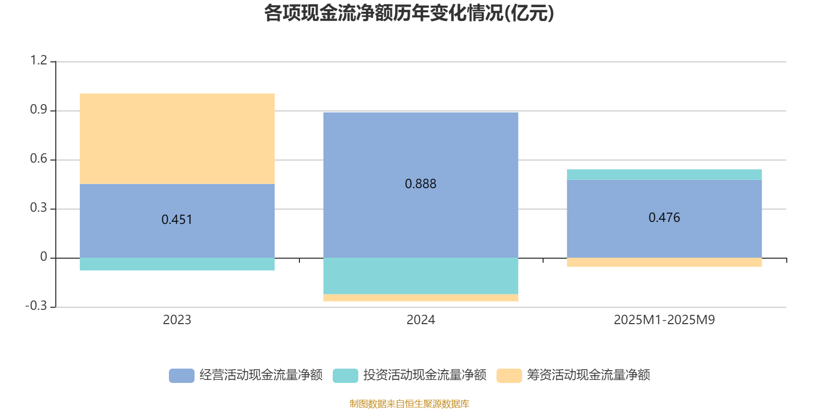 2025年1月至9月,公司经营活动现金流净额为4764.2万元,同比下降21.84%;筹资活动现金流净额-557.2万元,同比减少96.3万元;投资活动现金流净额636.7万元,上年同期为-1025.8万元。
